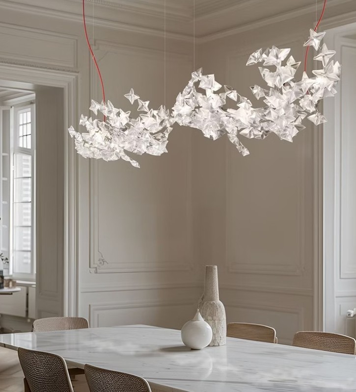 La suspension Hanami est composée de fleurs en Lentiflex® ( matériau incassable qui permet de recréer la préciosité du diamant) sur une structure en aluminium laqué et polycarbonate.
