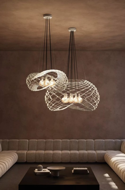 La suspension Net Big est composée d'un diffuseur fabriqué à partir d'une tôle acier plate découpée au laser et basée sur des lignes alternées concentriques. Lorsque la suspension est allumée, elle crée un jeu d'ombres délicates.